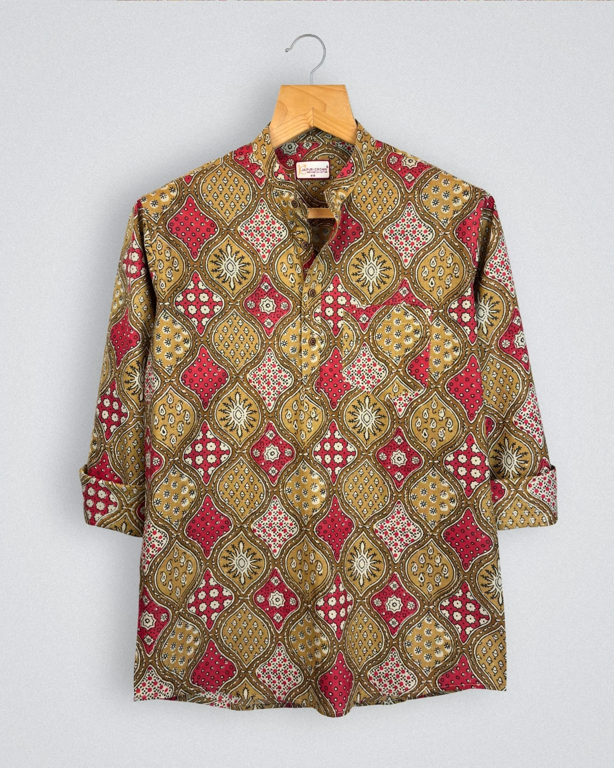 Step into style with the Elegant Mosaic by Jaipuri Crown – a striking Short Kurta featuring an intricate geometric print in rich hues of gold, red, and cream. Made from 100% Sanganeri cotton, this Kurta ensures a comfortable and breathable fit, perfect for festive occasions, family gatherings, or casual outings with friends.