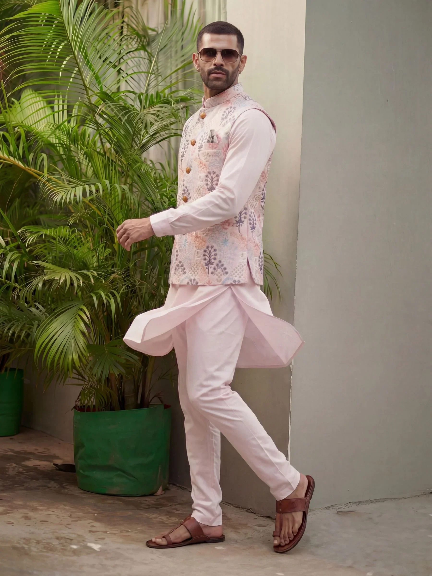 Crafted with intricate Embroidery Designer fabric, this Men’s Peach Nehru Jacket combines timeless elegance with modern flair. Its rich texture and refined fit make it a perfect addition to any sophisticated wardrobe