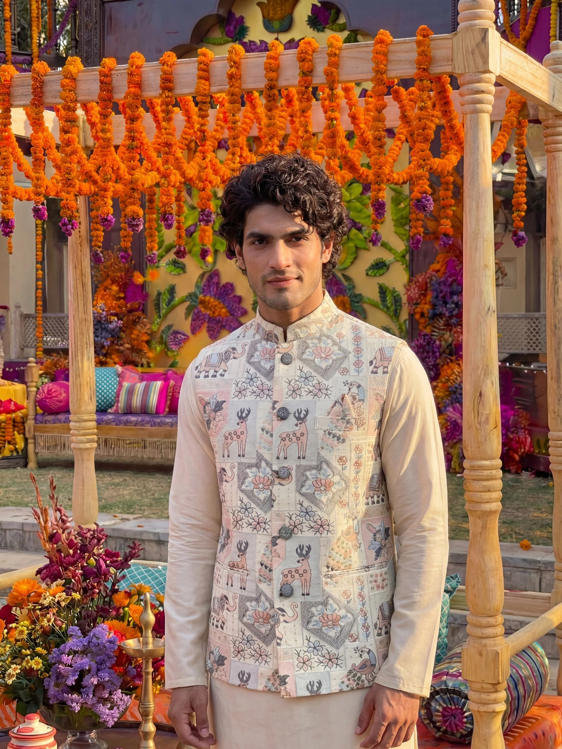 Crafted with intricate Embroidery Designer fabric, this Men’s White Nehru Jacket combines timeless elegance with modern flair. Its rich texture and refined fit make it a perfect addition to any sophisticated wardrobe
