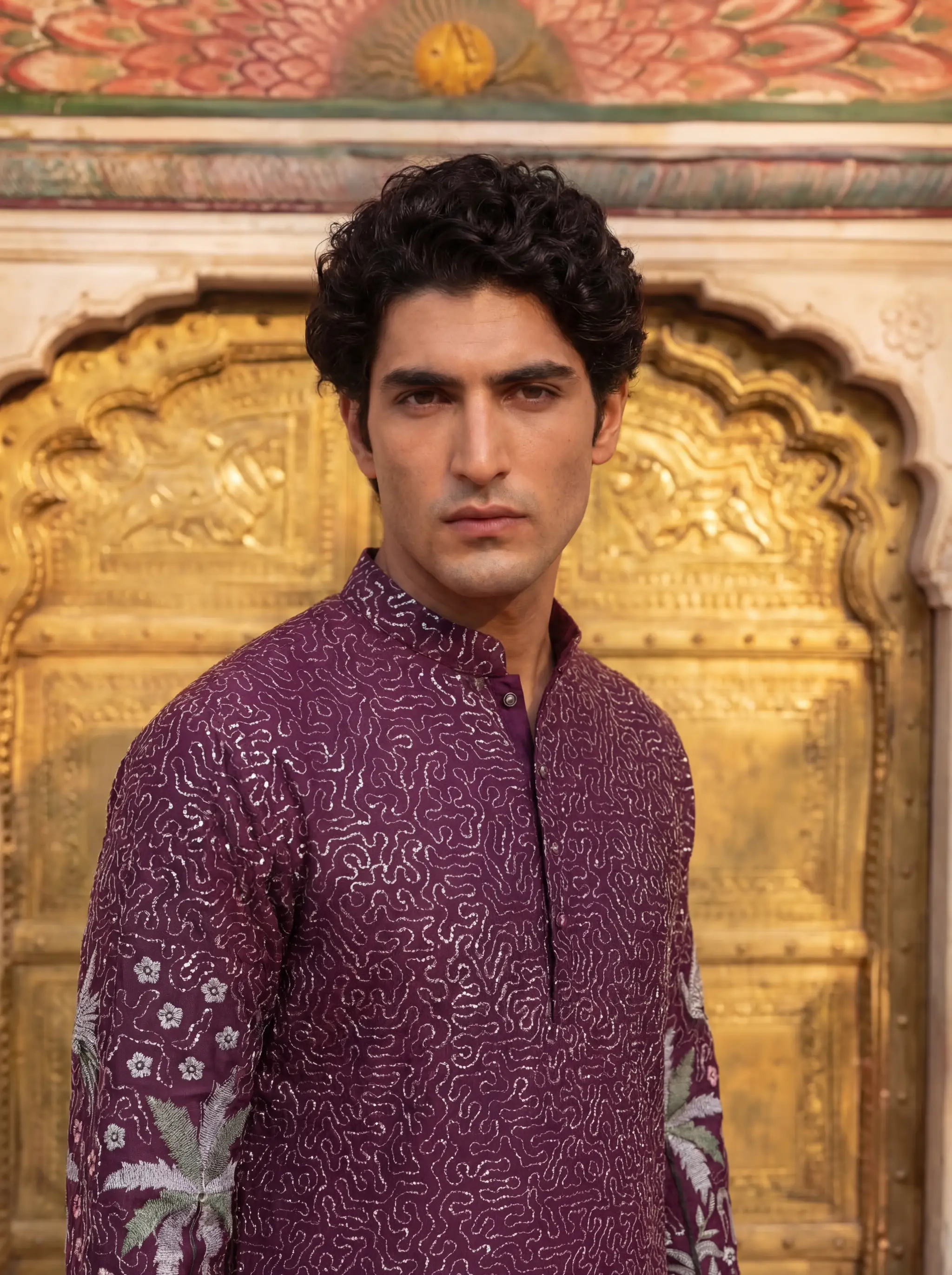 Men’s Heavy Designer Long Kurta – Purple Embroidered