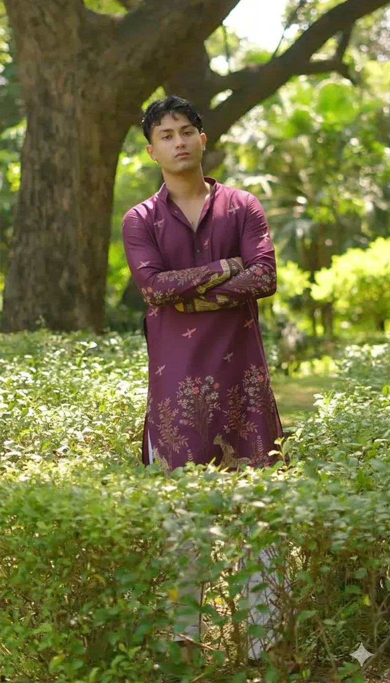 Men’s Heavy Designer Long Kurta – Purple Satin Embroidered