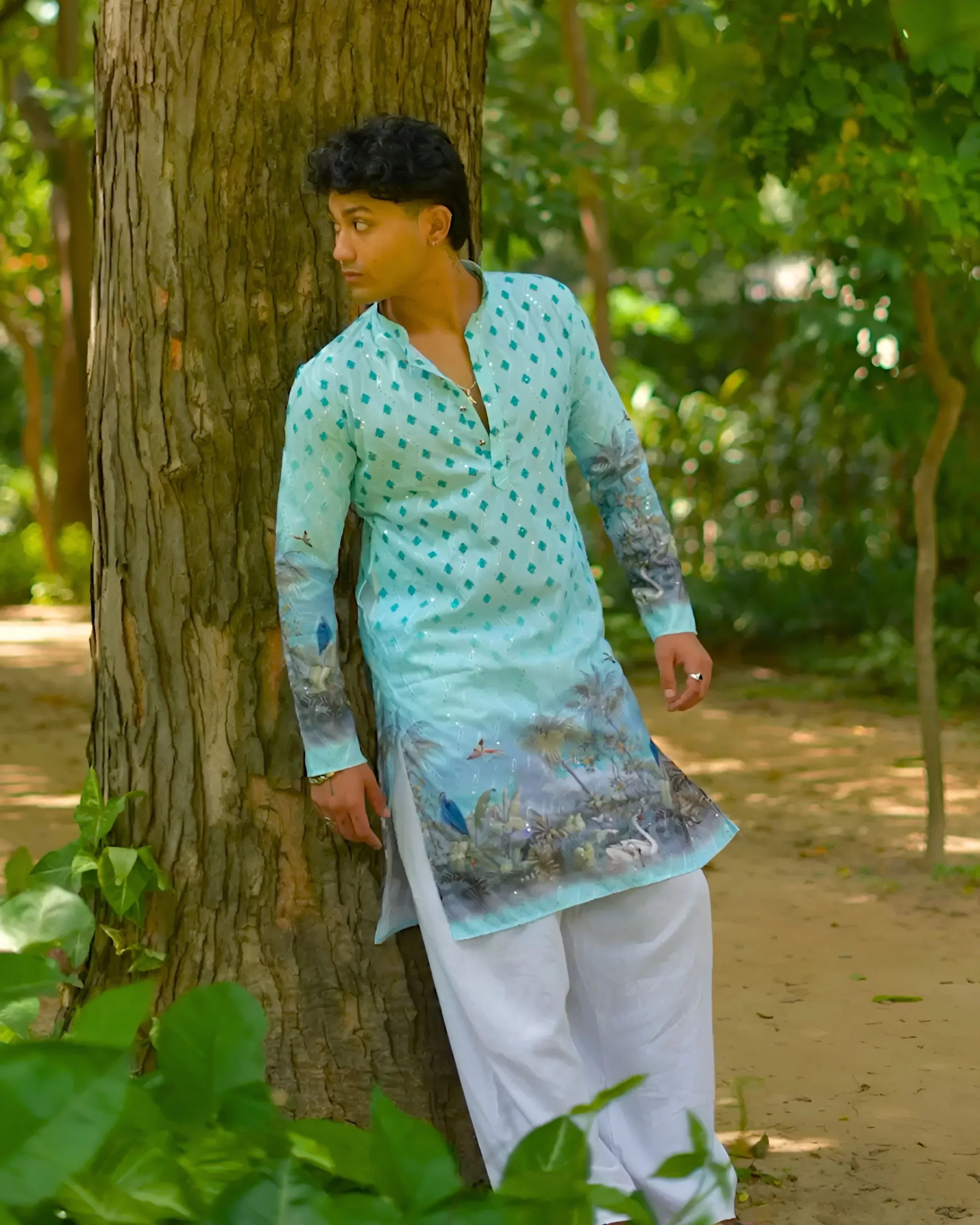 Tropical Mist – Aqua Blue Printed Long Kurta for Men
