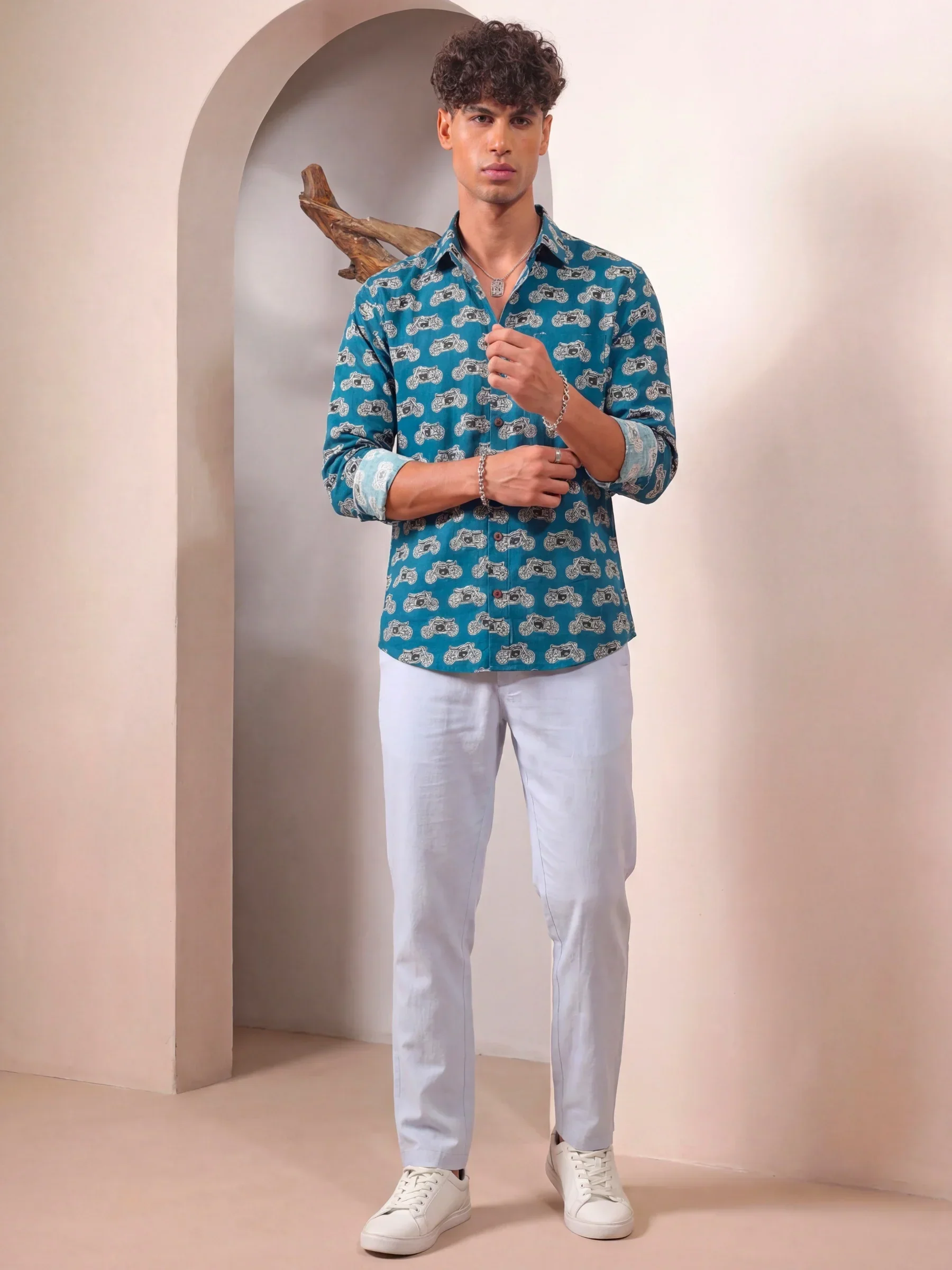 Rev up your style with Vintage Wheels by Jaipuri Crown – a trendy Full sleeve cotton shirt featuring a unique motorcycle print in cream against a vibrant teal background. Made from 100% Sanganeri cotton, this shirt provides a soft and breathable feel, perfect for casual outings, weekend adventures, or simply lounging in style.