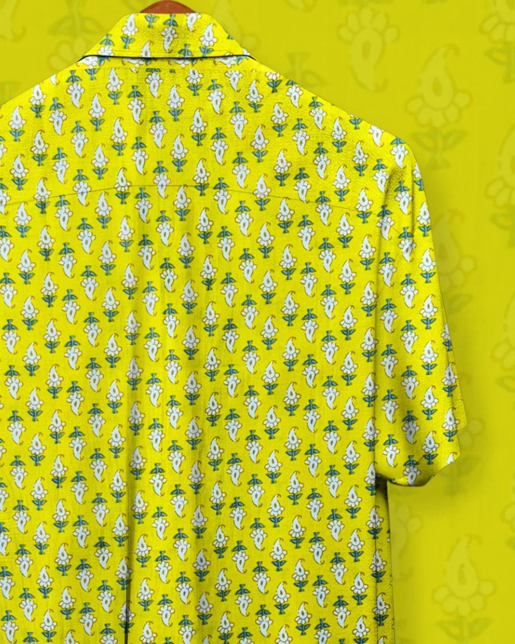 Brighten up your wardrobe with our Sunny Bloom shirt – a vibrant piece crafted in 100% Sanganeri cotton featuring a cheerful white floral print on a radiant yellow base. This half sleeve shirt is the perfect pick for sunny days, casual hangouts, or festive wear with an ethnic twist.